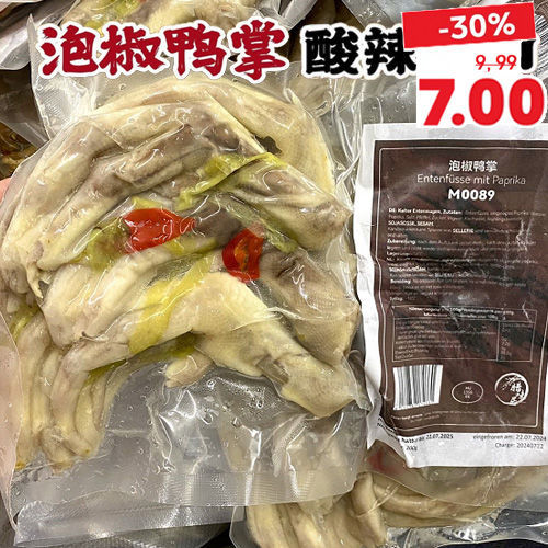 Entenfüße gegart, Wasser, Sesamöl, Salz, Zitronen, Koriander, Gewürze, Chilli, Zucker, Sesamsamen, getrocknete Hühnerbrühe, Geschmacksverstärker E621/E635/E631, Maisstärke, Hühnenfleischpulver, Gewürze, HühnerfettHefeextrakt, Sojasoßenpulver enthält Weizen Gluten, Soja