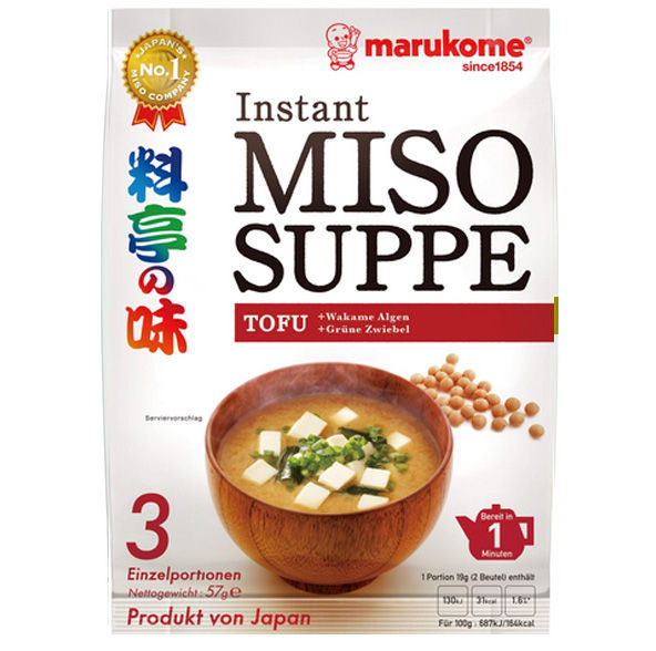 Miso-Würzpaste (Miso Paste(Wasser, Sojabohnen, Reis, Salz) Wasser, Alkohol, Zucker, Hefeextrakt, hydrolisiertes Fischeiweiß, Thunfischpulver, Salz, getrockneter Thunfisch, Seealgenextrakt), gebratener Tofu (Sojabohnen, Palmöl, Festigunsmittel: Calciumsulfat, Magnesiumchlorid, Glucono-delta-lacton), Wakame Algen, Frühlingszwiebeln